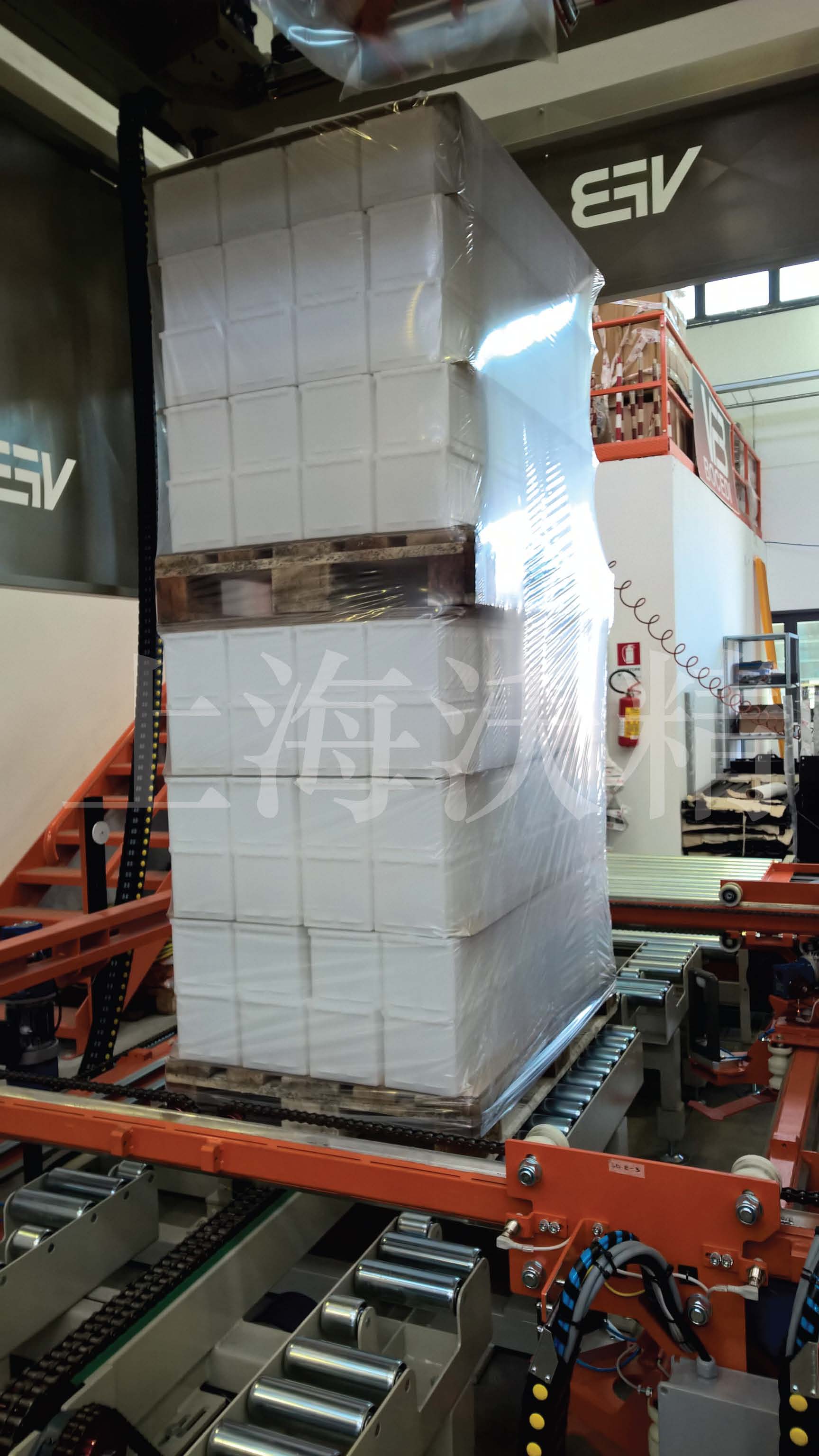 ? 環(huán)帶圍膜拉伸程序: 通過在垛形指定的高度位置套上環(huán)形圍膜薄膜,來提高產(chǎn)品穩(wěn)定性。
