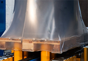 ? 底部拉伸程序: 拉伸膜緊緊的包裝和釋放到托盤底部,讓托盤和垛形更加緊固一個整體。